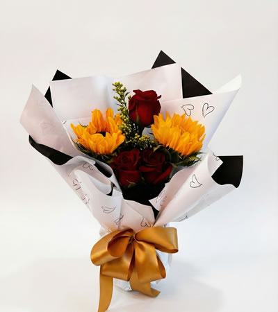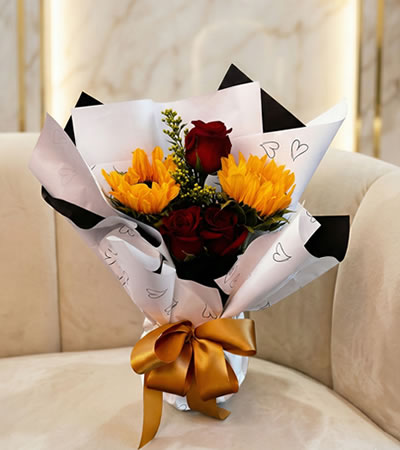 Brighten their day instantly with the Good Vibes bouquet. This arrangement captures the perfect balance of joy and elegance, featuring radiant Sunflowers paired with Red Roses.
